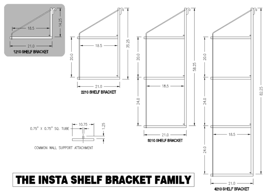 The INSTA One-Shelf Bracket delivers superior strength, yet appears slim and trim. The bracket provides the ability to customize your storage space by seamlessly integrating with the INSTA 2210, 3210 and 4210 shelf brackets. The brackets are a breeze to install. Simply hook them onto the shipping container D-rings, add your wood shelves and begin storing. This bracket has one arm and uses two 2×10 pieces of construction grade wood (not included) to make a shelf that is 18.5” deep. A minimum of two bracket units are required to make a shelving system.